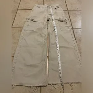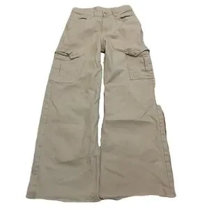 Description: These are stylish and comfortable Refuge wide-leg cargo pants in a neutral khaki color. They feature classic cargo pockets on the sides, a button and zipper closure, and a raw hem for a trendy, casual look. These pants are perfect for creating a relaxed yet fashionable outfit. Made in Bangladesh.