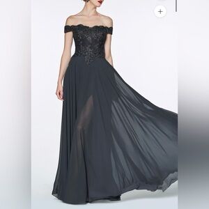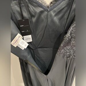 Sophisticated charcoal gown with intricate lace accents. Ideal for elegant events. Never used, new with tags
