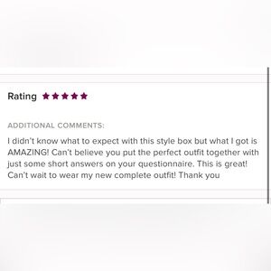 @amariecohns Hey 👋 Thanks for your box purchase! I’m so excited to start styling you. In the description above ☝️ is the buyer’s style guide questionnaire— answer what you can and reply with your responses. You can comment here or go to your purchases and 📩 me there. Thanks again! 💖