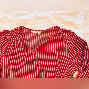 Stylish wrap blouse with red and white stripes. Features a tie waist and long sleeves.
