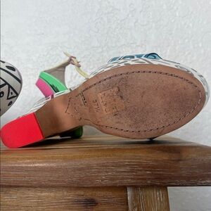 Bold platform heels with artistic patterns. Features a mix of blue, pink, green, and black. Perfect for a standout look.