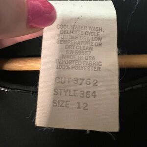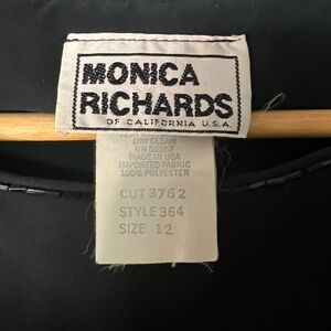 This elegant black layered dress features a sophisticated design perfect for any occasion. The long sleeves and flowing layers add a touch of class. Ideal for evening events or a stylish day out. Monica Richards of California USA brand long sleeved dress with ruffle layered skirt. Beading at the neckline and on the cuffs. Three buttons on each shoulder. Oh, and SHOULDER PADS!! The only flaw I noticed was a small spot of discoloration on the front right of the chest, but it’s only noticeable when you’re very close to it. Size 12. Measurements taken when dress is lying flat and are approximate.