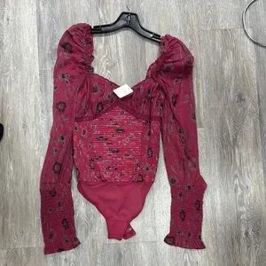 The Free People bodysuit showcases a striking red hue with long puff sleeves and a ruched bustier design. Crafted with a romantic flair, this top features a fitted silhouette and ruffled details, making it a standout piece for any wardrobe. Its elegant construction and dramatic sleeves add a touch of vintage-inspired charm. New with tags.