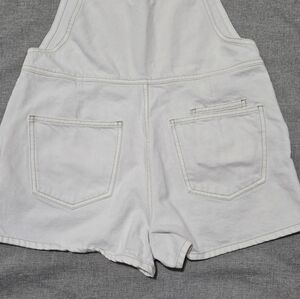 White denim short overalls with multiple pockets and silver toned hardware. The overalls have adjustable straps.