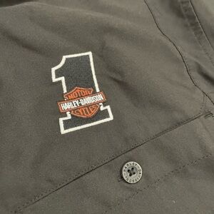 Classic Harley-Davidson shirt. Black fabric with orange accents. Features branded buttons.