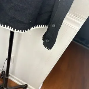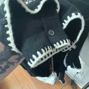 Elegant black cardigan with vibrant floral embroidery. Features intricate designs in pink, blue, and green. Perfect for adding a touch of color to any outfit.