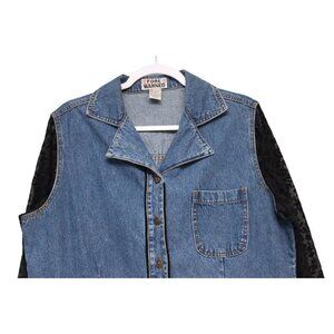 This vintage 90s denim maxi dress in size 14 features a collared neckline, long sleeves, and a sheer animal print velvet burnout fabric accent. The dress is made of 100% cotton denim, giving it a classic and bohemian vibe. The button closure and solid blue color add to its timeless appeal, while the long dress length makes it suitable for various occasions, from casual outings to travel adventures. This piece from the brand Forewarned embraces a mix of retro and modern styles, making it a versatile addition to any wardrobe.