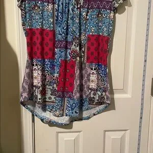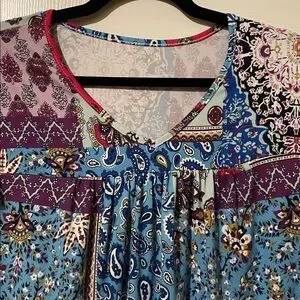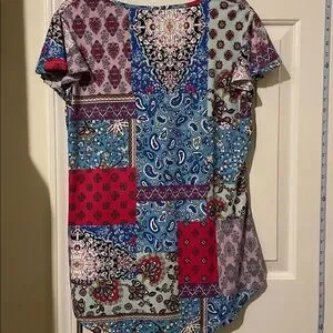Vibrant patchwork design with short sleeves. Features a mix of blue, red, purple, and gray patterns.