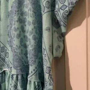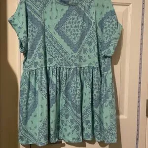 Chic top with intricate blue and green patterns. Comfortable and stylish.