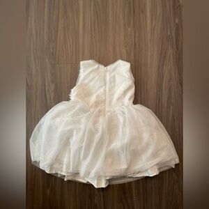 Elegant white sleeveless dress with floral details and a tulle skirt. Perfect for special occasions.