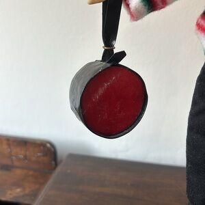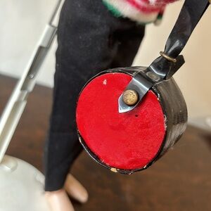 Charming doll with a red bow and striped outfit. Perfect for collectors.