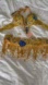 Stunning gold and blue beaded dance costume with intricate details and fringe accents.