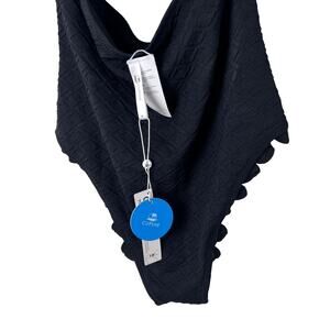 Cupshe Black Knotted Scalloped One Piece Swimsuit in women’s size Medium. This chic and flattering swimsuit features a textured diamond fabric, scalloped trim, front knot detail, and trendy cutout waist for a feminine, hourglass-enhancing fit. Adjustable straps and a clasp back closure complete the look — perfect for beach days, pool parties, and tropical vacations.