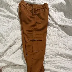 Stylish, silky cargo jogger pants with elastic waistband and cuffs. Features side pockets for convenience.