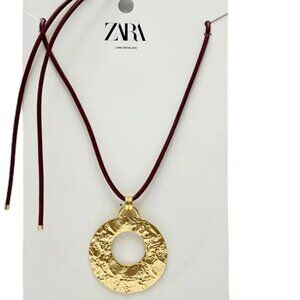 Zara Brown Corded Necklace With Textured Gold Plated Circle Charm New ✨✨🔥