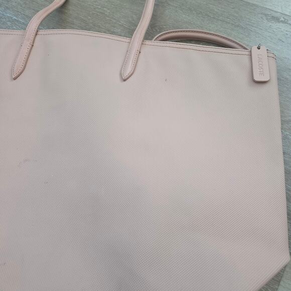 Lacoste Pink Large L.12.12 Concept Tote Shoulder Bag $110 Minimalist Casual. some condition from use as pictured. This large, lightweight zipped tote is big enough to hold a 15” laptop. The star of the L.12.12 Concept collection, featuring an embossed piqué effect inspired by the iconic Lacoste polo from 1933. The wide handles are pointed at the ends in a subtle nod to golf tees. measurements are approximately: 13.5 x 11 x 4.5 inches. Outside: PVC (100%).