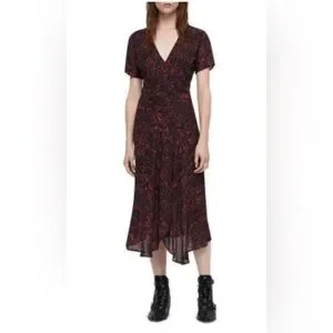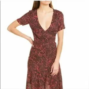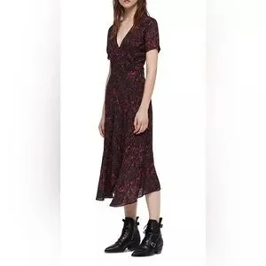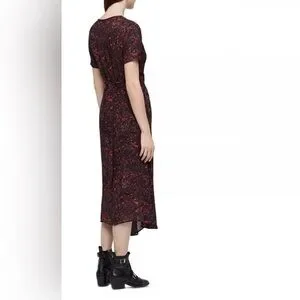 Moody, romantic, demure, edgy… how will you style this dark rose? A lined, midi wrap dress with tie waist, v-neck, short sleeves and swish in the skirt with rounded hem. A versatile addition to your wardrobe across the seasons. Fits on the smaller end of medium, a full bust would likely want to add a camisole. A slim size 8 or a fuller size 6.