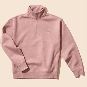 A throw-on-and-go essential with a roomy fit for never-ending comfort, and quarter-zip design for easy on and off. Universally flattering dusty rose colorway, topped with an embroidered monogram on the chest and Rare Beauty logo on the sleeve. Made with 70% cotton, 30% polyester.