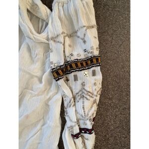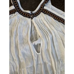 Channel free-spirited vibes in this stunning cold shoulder blouse! Exquisite embroidery and intricate beadwork adorn the soft, textured fabric. The flowing silhouette and peek-a-boo shoulders add a touch of flirtatious charm, making it a standout piece for any bohemian-inspired ensemble. This blouse is perfect for a music festival, a beach vacation, or a casual brunch with friends. Small flaw noted in photos