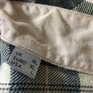 Tag says L but this one is more of a Medium with the tapered cut and seams up the back of the shirt.