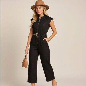 NWT 100% Cotton Black Gold Front-Zip Capped Sleeve Jumpsuit with Belt, XL