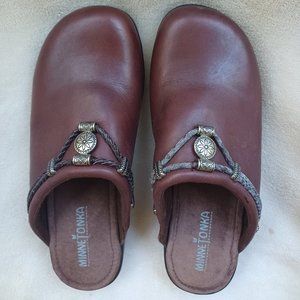 EUC Stylish Minnetonka mules in rich brown. Features silver accents for a touch of elegance. Comfortable and versatile.