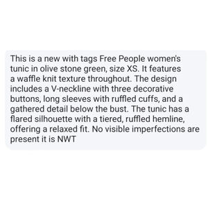 Elevate your wardrobe with the Free People Olive Stone Green Waffle Knit Ruffle Tunic Top. This stunning piece combines comfort and style effortlessly, making it perfect for any occasion. Crafted from soft, breathable fabric, it ensures all-day wear without compromising on elegance. The ruffle details add a playful touch, while the olive stone green hue offers a chic, earthy vibe. Dress it up for brunch or keep it casual for a day out; this versatile tunic is your go-to option. With its flattering fit and unique texture, you'll feel confident and stylish wherever you go. Don’t miss out on this must-have addition to your closet—grab yours before it’s gone!