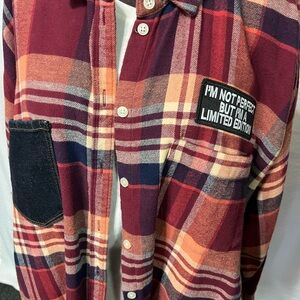 Casual plaid shirt with surf team graphic. Bold red and orange colors. Perfect for laid-back style.