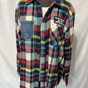 Colorful plaid flannel shirt featuring Super Mario graphic on the back.