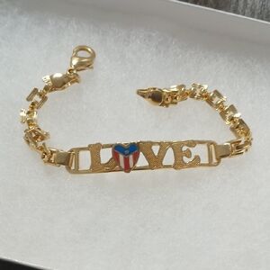 Elegant gold bracelet featuring a 'LOVE' design with a colorful accent. Perfect for adding a touch of sophistication to any outfit.