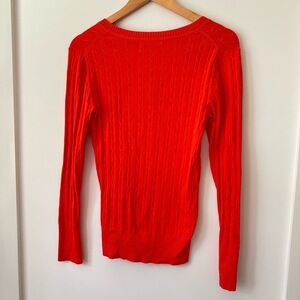 Bright orange fitted cable knit sweater with a deep V-neck and ribbed cuffs and hem. A timeless layering essential that gives clean, preppy vibes. Slightly stretchy and super flattering