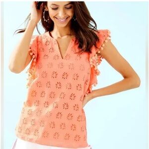 LILLY PULITZER Orange Eyelet “Astara” Ruffle Pom Pom Sleeve Blouse