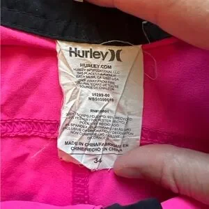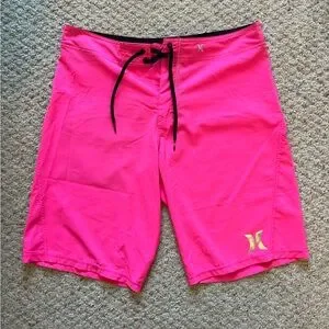 Vibrant pink swim shorts with a black waistband. Features Hurley branding. Zipper pocket on back.
