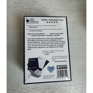 The game is simple to play: one person reads a question or fill-in-the-blank card aloud to a group of friends. Each player then gives an answer card that they think best responds. The reader picks the response they like best. The questions and clues are both a parody and a celebration of all our bizarre cultural hang-ups around weddings and marriage, and funny enough to make champagne squirt out your nose.