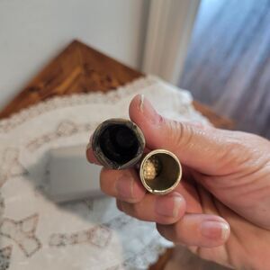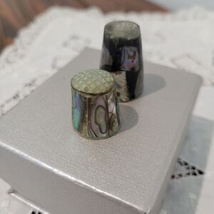 The product is a set of two vintage inlaid abalone shell thimbles, featuring a mother of pearl design. These thimbles are collectibles from the mid-century modern era, making them a unique and decorative item for sewing crafts or vintage enthusiasts. Made from abalone shell and mother of pearl, these thimbles are a rare find and a charming addition to any collection.