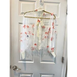 This divine plus size blouse is crafted in a creamy ivory sheer mesh with threaded lines and dainty orange fabric butterflies flying throughout. Complete with a button up front, attached neck tie, and button cuffs.