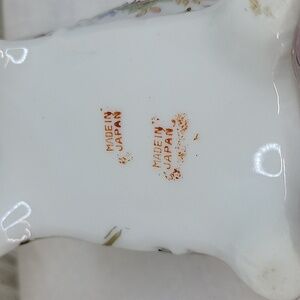 Charming porcelain box with floral design. Features pink and green accents. Made in Japan. Filled with earrings.