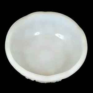 A beautiful example of McKee’s Toltec Milk Glass, this 7-inch footed bowl features an interesting three-toed design. The pressed milk glass construction showcases intricate detailing, characteristic of McKee’s early 20th-century craftsmanship.