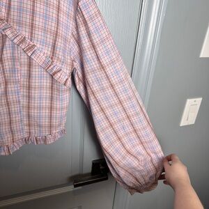 Absolutely stunning blouse from sustainable indie dopamine brand Kina and Tam in a beautiful pink plaid with all over ruffles, balloon sleeves, knot buttons, and flower button details at the cuffs.
