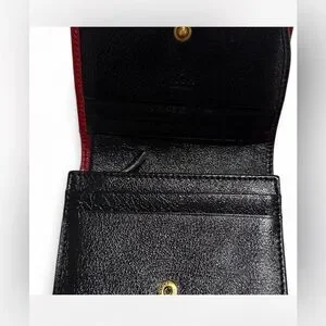 Gucci Compact Wallet/ black Leather with red leather trim/ GG Logo/ Gold-Tone Hardware/ Leather Lining & Dual Interior Pockets with Card Slots/ Snap Closure