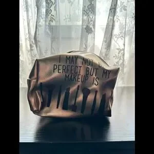 Keep your beauty essentials organized in style with this Metallic Rose Gold Cosmetic Bag. Featuring the playful quote "I May Not Be Perfect But My Makeup Is" along with makeup brush illustrations, this bag is perfect for makeup lovers. The spacious interior provides ample room for all your cosmetics, while the sturdy zipper closure ensures everything stays securely in place. The sleek metallic rose gold exterior adds a touch of glamour, making it a chic accessory for travel or daily use. Stay organized and fashionable with this eye-catching cosmetic bag!