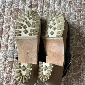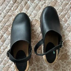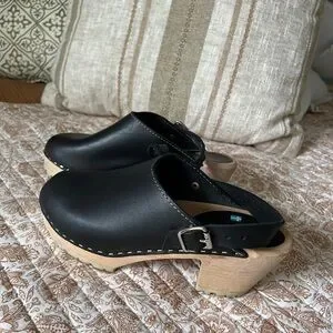 Step out in style with these chic black leather clogs by Lotta from Stockholm. Gently worn with lots of life left. The strap can worn over the heel for security or flipped down and worn across the top of the shoe. Size 9.5 or 40