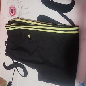 Sleek Adidas track pants in black with bold yellow side stripes. Features ankle zippers for adjustable fit and sporty flair. Soft, breathable material ideal for casual wear or light workouts. 38x29 Condition: Gently worn, excellent shape Material: polyester, cotton blend, etc.]