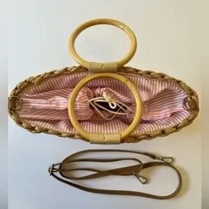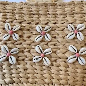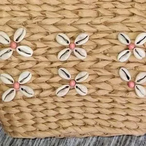 Stylish tan woven tote bag featuring charming floral accents. Perfect for casual outings and beach days. Collection Eighteen Seagrass Bamboo Seashell Bag.