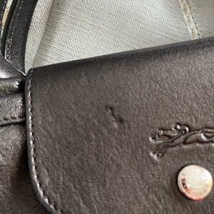 Authentic Longchamp black calf leather tote with silver tone hardware interior features one zippered pocket and one flat pocket zipper closure optional leather shoulder strap with a 15 in drop interior is in excellent condition there is a small “dent” in the leather flap please see photo measurements approximately 13 height 17 inches wide base of 6 1/4 inches