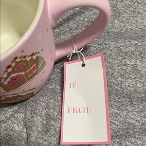Delightful pink mug featuring a gingerbread motif. Ideal for festive beverages.