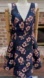 Chic Betsey Johnson dress is navy blue brocade with vibrant light pink flowers. Dress is very structured, and made from polyester, rayon, and metallic.