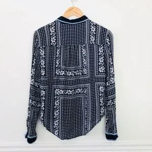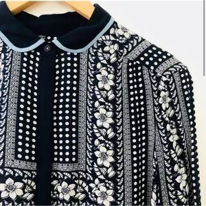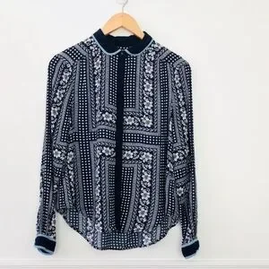 Stylish navy blouse with intricate white patterns. Long sleeves and button-up front. Perfect for casual or dressy occasions.