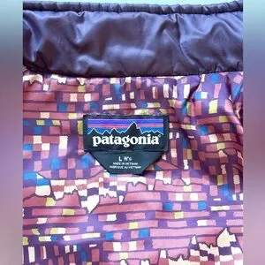 Eye-catching Classic Patagonia jacket with a unique purple and red patterned lining. Ideal for everyday outdoor wear.