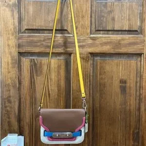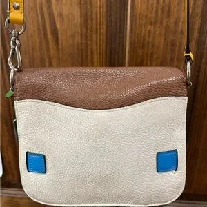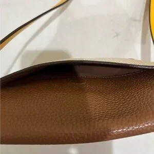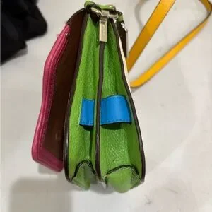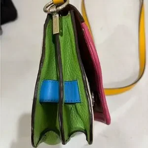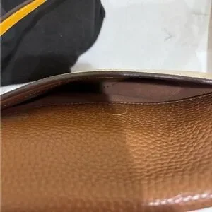 This purse is in excellent condition. It is 8 1/2” wide and 7” tall, has 5 inside pockets and one back pocket